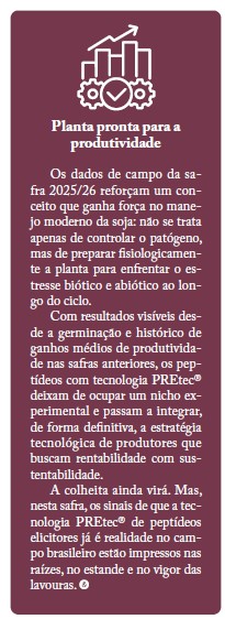 Peptídeos elicitores com tecnologia PREtec® avançam no tratamento de sementes e mostram, ainda antes da colheita, ganhos consistentes em vigor, estande e sanidade da soja.