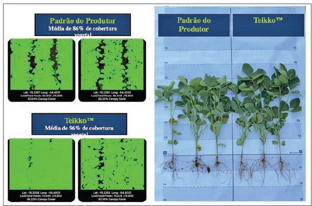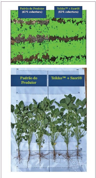 Figura 2. Efeito do uso de TeikkoTM + Saori® no desenvolvimento da soja e na cobertura vegetal aos 39 dias após o plantio. Cultivar Olimpo, Claudia (MT)